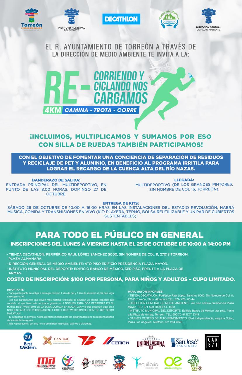 Torreón, Coahuila. – La dirección General de Medio Ambiente y el Instituto Municipal del Deporte (IMD), en conjunto con la Tienda Decathlon, informa que se amplió el registro y la fecha de la carrera 4k “Recorriendo y reciclando, nos recargamos”.