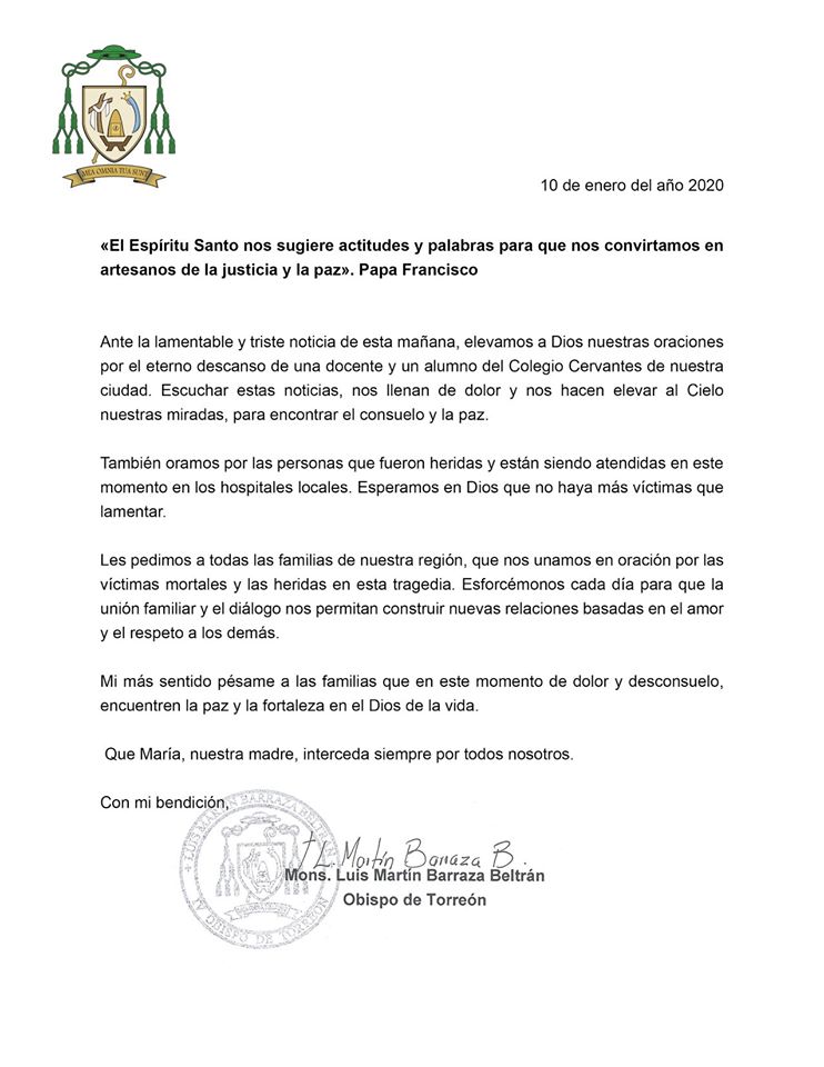 “La muerte violenta siempre nos atemoriza y más cuando es perpetrada desde la edad inocente”, menciona en un comunicado emitido esta tarde por la Diócesis de Torreón, en torno a los acontecimientos suscitados hoy en el Colegio Cervantes, donde un alumno disparó contra su maestra y luego se suicidó.