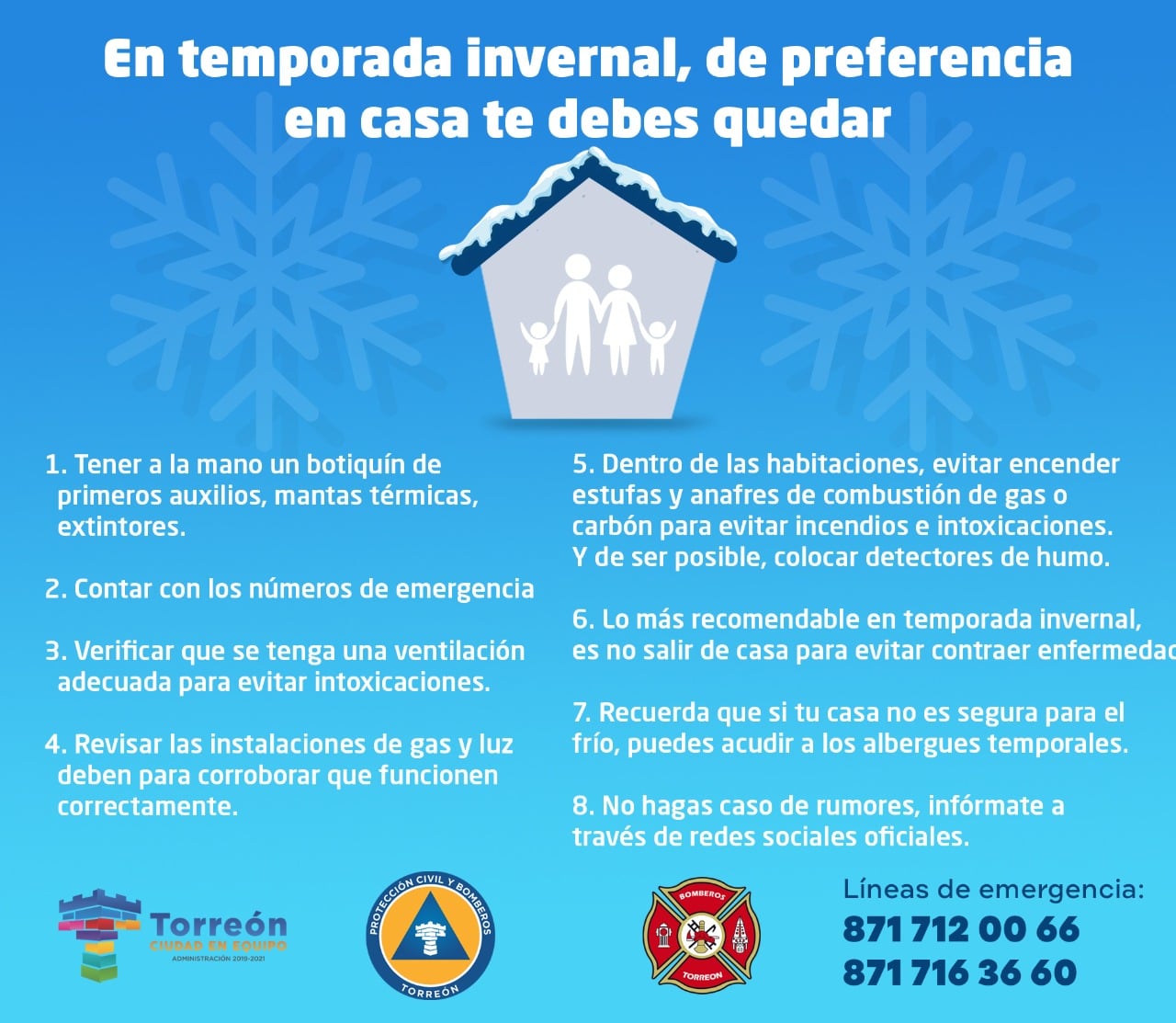 Durante la época invernal suelen ocurrir más accidentes por intoxicaciones y enfermedades respiratorias, por eso Protección Civil Torreón pide tomar en cuenta las siguientes recomendaciones en caso de una emergencia