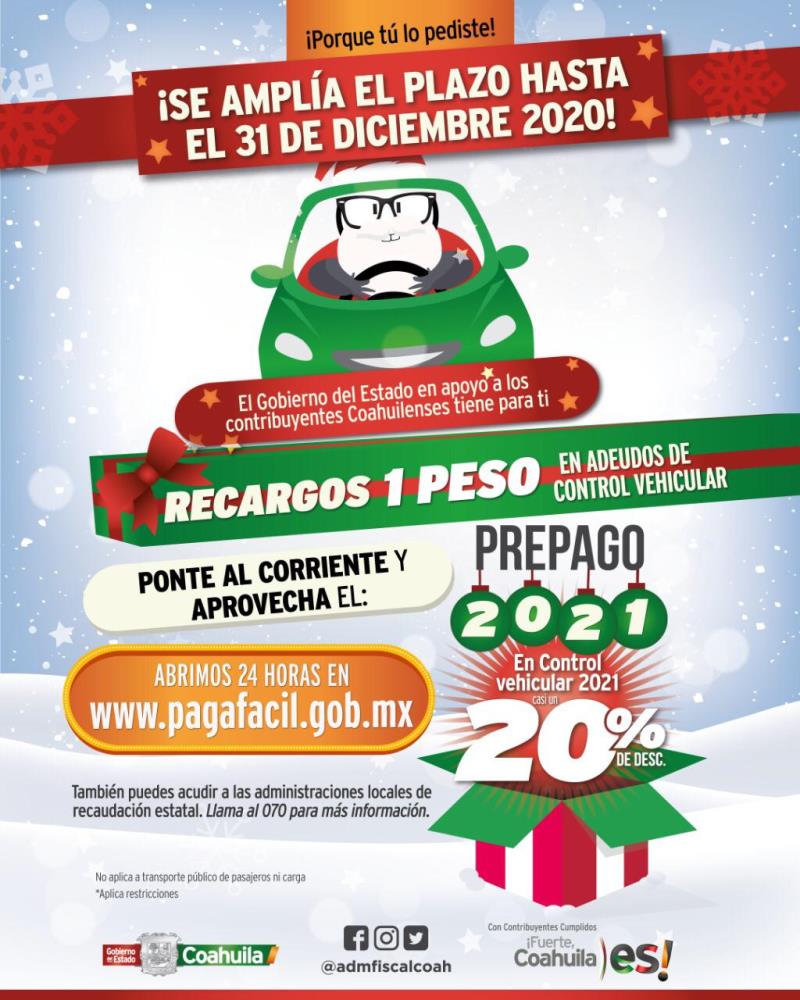 El Gobierno del Estado de Coahuila, en apoyo a la economía de los coahuilenses, extendió las promociones del Prepago 2021 hasta el día último de este 2020.