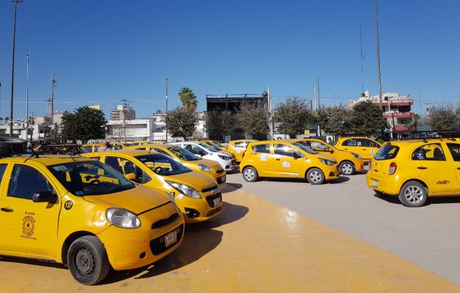 Torreón, Coahuila. – Un grupo de taxistas realizó una manifestación en la Plaza Mayor para exigir a la autoridad que puedan subir más de dos pasajeros en cada unidad.