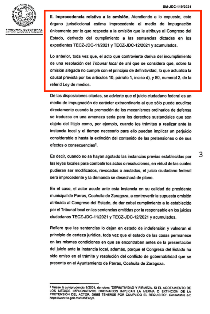 De esta forma, el edil parrense tendrá que acatar las disposiciones del TEECZ, que, bajo el expediente SM-JDC-119/2021, en forma clara exhortó a las y los integrantes del Ayuntamiento de Parras, Coahuila, para que actúen de acuerdo con la normatividad, además de dar vista al Congreso del Estado para que, en caso de que así lo estime procedente, proceda de conformidad con lo dispuesto por los artículos 115 de la Constitución Política de los Estados Unidos Mexicanos y 158-L de la Constitución local, en relación con el 69 y 70 del Código Municipal de esa entidad, para garantizar el funcionamiento regular del Ayuntamiento.