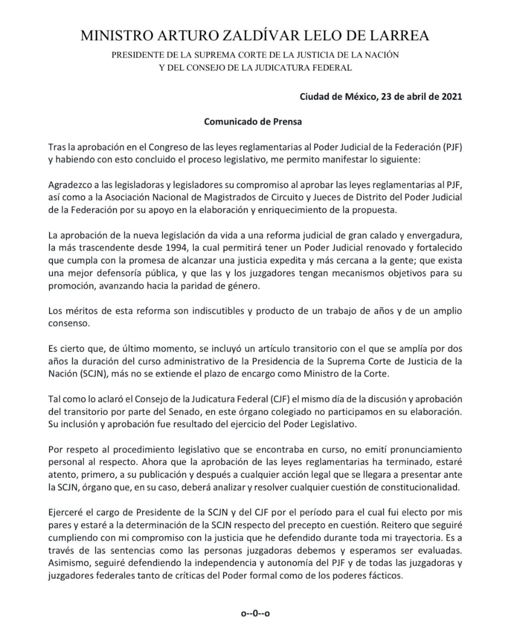 El ministro presidente de la Suprema Corte de Justicia de la Nación (SCJN), Arturo Zaldívar se pronunció luego de que en la Cámara de Diputados se confirmara la aprobación del dictamen de la Ley Orgánica del Poder Judicial, incluyendo el artículo 13 transitorio que amplía hasta el final del sexenio la presidencia del ministro de la Suprema Corte de Justicia de la Nación.