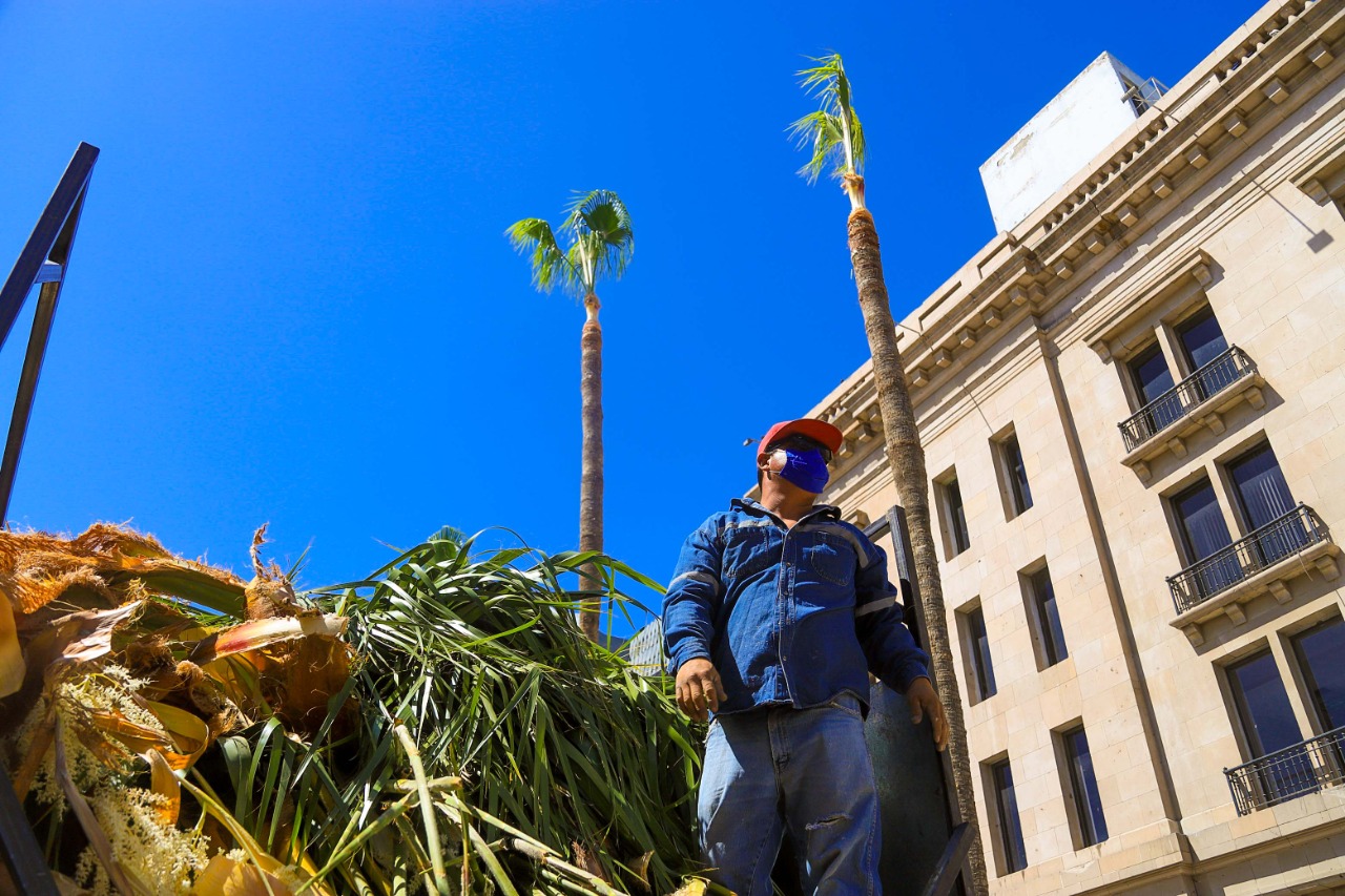 Los trabajos se llevaron a cabo con una hidrolavadora para quitar el exceso de grasas y suciedad impregnada en el piso. Asimismo, se dio mantenimiento a las palmas ubicadas entre la calle Cepeda y Valdez Carrillo.
