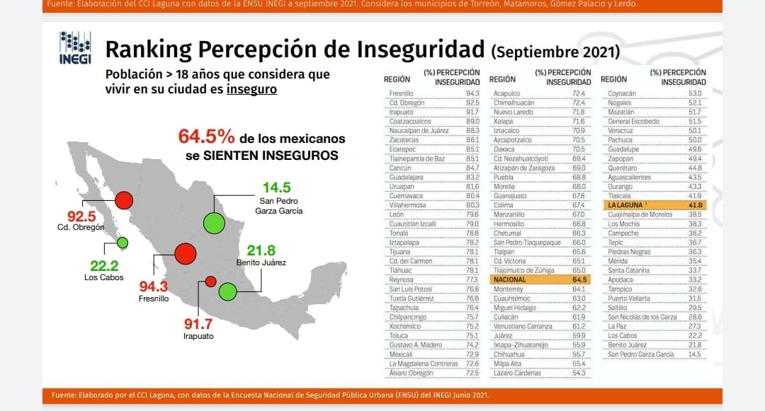 De acuerdo al análisis que hace el Consejo Cívico de las Instituciones Laguna (CCI) al tercer trimestre del 2021, la percepción de inseguridad disminuyó de un 53.9 por ciento en el 2020, al 41.8 por ciento en e 2021, lo que representa un avance importante, pues a nivel nacional sólo una, de cada cuatro ciudades evaluadas tuvieron mejoría.