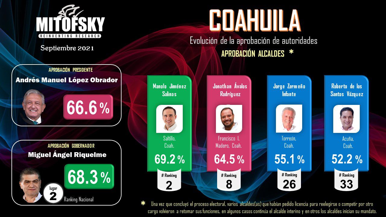 De acuerdo a Consulta Mitofsky, el gobernador de Coahuila, Miguel Riquelme, y el alcalde de Saltillo, Manolo Jiménez Salinas, superan en porcentaje de aprobación al presidente de la República, Andrés López.