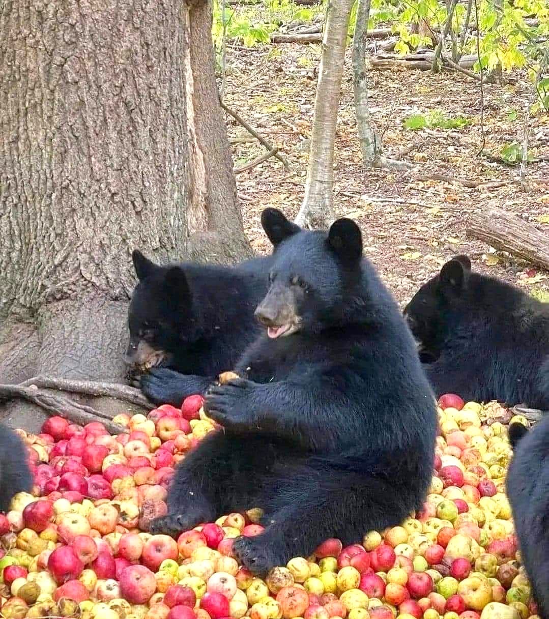 En ella se ve a un grupo de osos negros sentados encima de un montón de manzanas cosechadas en un huerto de este pueblo mágico, antes de que estas sean recogidas para ser empacadas.