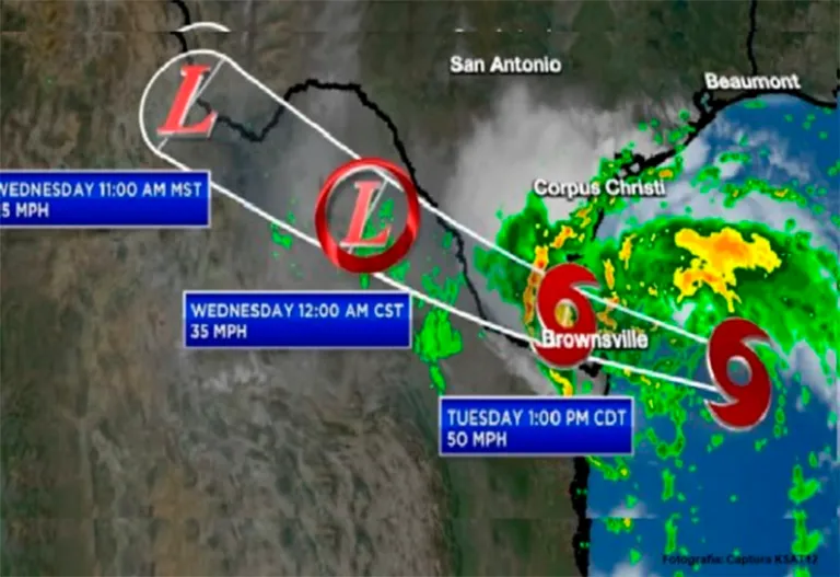 Se generarán lluvias puntuales torrenciales en Coahuila, Nuevo León, Chihuahua y Tamaulipas, así como lluvias muy fuertes en Veracruz.   Se espera que impacte y se desplace sobre el sur de Texas, y en el transcurso de la mañana, pase aproximadamente a 55 km al norte de Matamoros, Tamaulipas, con vientos máximos de 75 km/h, rachas de 95 km/h y desplazamiento rápido hacia el oeste-noroeste como tormenta tropical; a 30 km al sur de Nuevo Laredo, Tamaulipas como tormenta tropical.