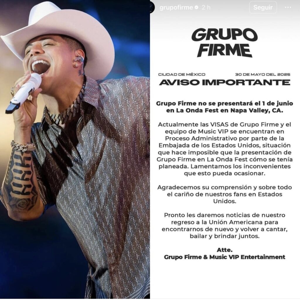 Grupo Firme ha cancelado su presentación programada para el 1 de junio en el festival La Onda Fest en Napa Valley, California, debido a problemas con sus visas de trabajo.