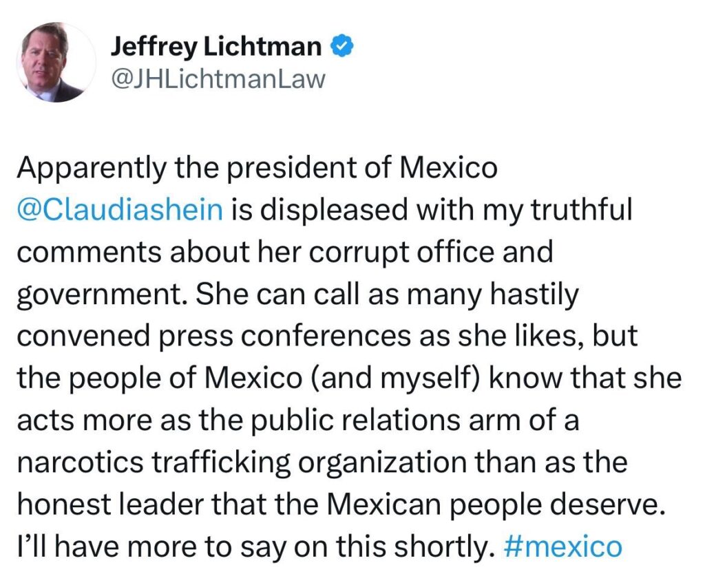 Reiteró que los comentarios de Lichtman sobre su gobierno “son irrespetuosos totalmente de la institución presidencial”, y negó que haya actuado como “brazo de relaciones públicas” para cárteles .