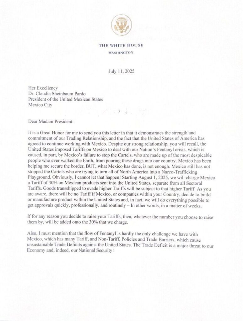 La carta también critica las políticas comerciales mexicanas por generar “déficits insostenibles” en la balanza comercial con Estados Unidos, y advierte que cualquier incremento recíproco en aranceles por parte del gobierno mexicano será sumado a la tarifa impuesta.