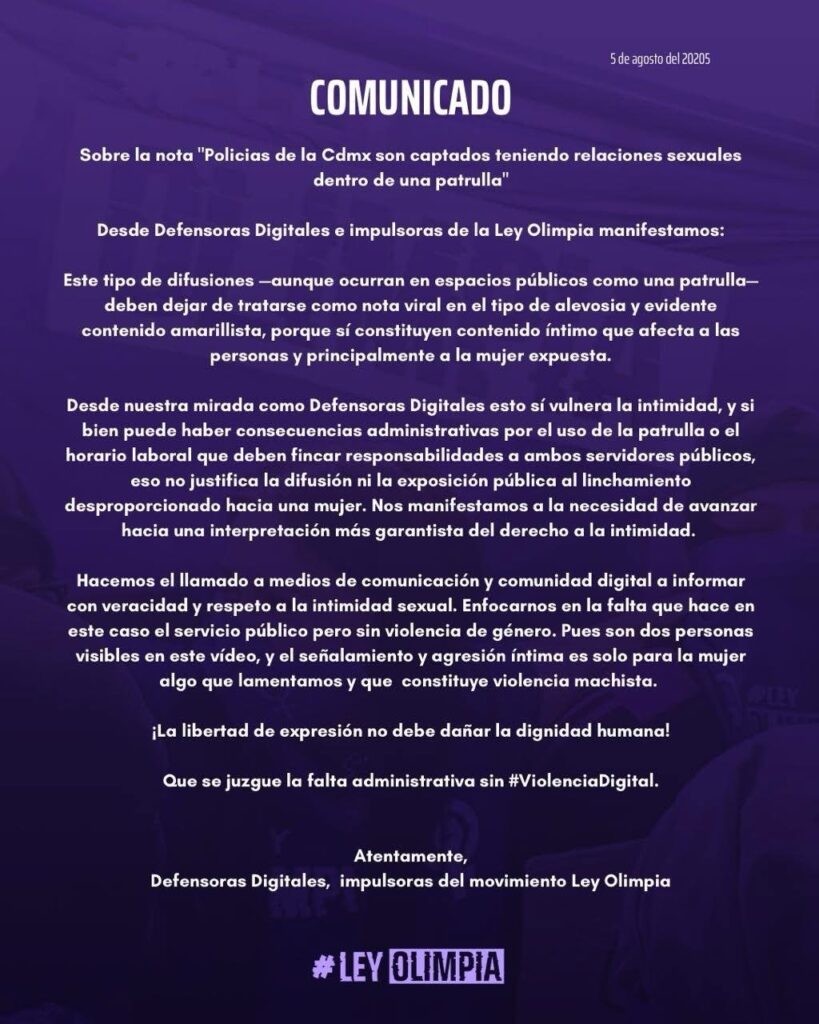 Tras la difusión de un video en el que se observa a dos elementos de la policía capitalina teniendo relaciones sexuales dentro de una patrulla, el colectivo Defensoras Digitales, impulsoras de la Ley Olimpia, emitió un posicionamiento en el que condena la viralización del contenido y llama a los medios y a la comunidad digital a actuar con responsabilidad y respeto hacia la intimidad sexual.