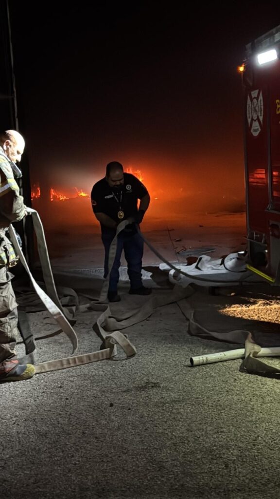 Al arribar, se confirmó que la bodega siniestrada, de aproximadamente 25 x 55 metros, almacenaba piezas de alumbrado público, basura y tarimas de madera.