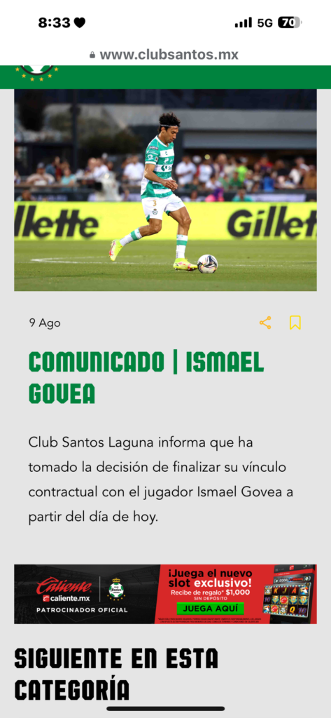 El Club Santos Laguna informó que, a partir del día de hoy, ha tomado la decisión de finalizar su vínculo contractual con el jugador Ismael Govea.
