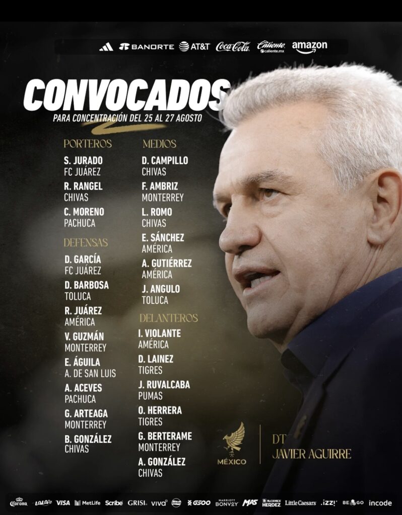 Javier “Vasco” Aguirre, director técnico de la Selección Mexicana, presentó hoy la convocatoria de 23 futbolistas, todos provenientes de la Liga MX, quienes participarán en un microciclo de preparación en el Centro de Alto Rendimiento (CAR) del 25 al 27 de agosto, como parte del proceso rumbo al Mundial 2026 .
