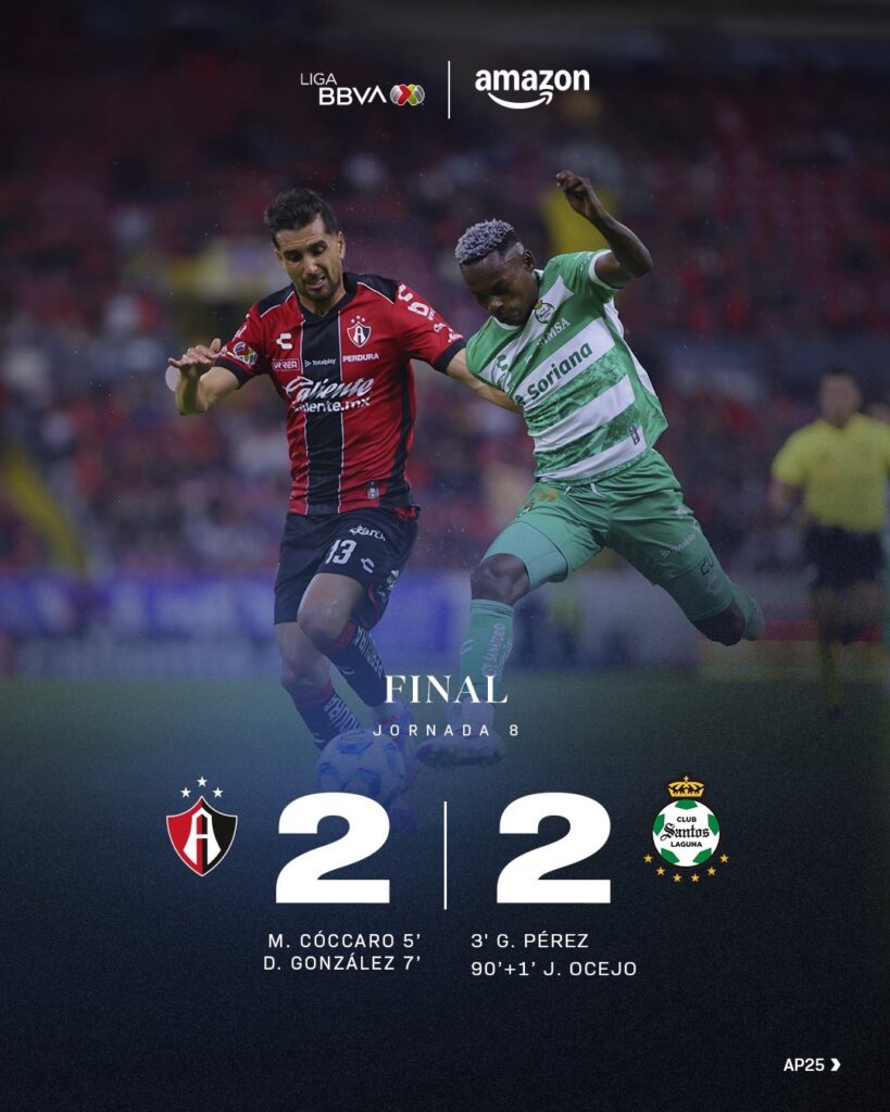 En un partido lleno de emociones correspondiente a la Jornada 8 del Torneo Apertura 2025, Atlas y Santos Laguna igualaron 2–2 este sábado en el Estadio Jalisco.