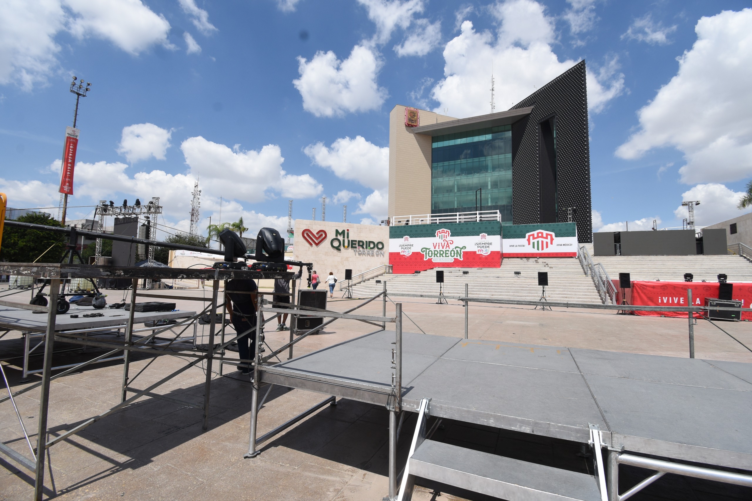 Previo al inicio de los festejos de las Fiestas Patrias en Torreón, personal de la Dirección de Protección Civil y Bomberos, realiza la revisión de las estructuras donde se montó el escenario que será utilizado durante esta noche, en la celebración del Grito de Independencia y el 118 aniversario de la ciudad.