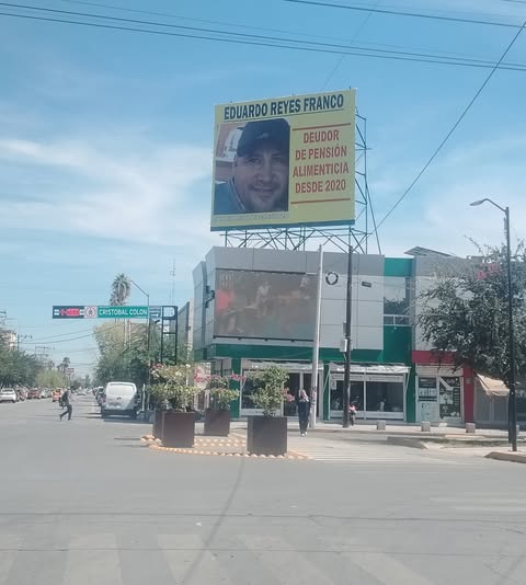 Un espectacular colocado en una de las zonas más transitadas de Torreón ha generado gran controversia entre los ciudadanos. El anuncio, ubicado en el cruce de la calzada Colón y la avenida Juárez, en el centro de Torreón, exhibe públicamente a un presunto deudor alimenticio.