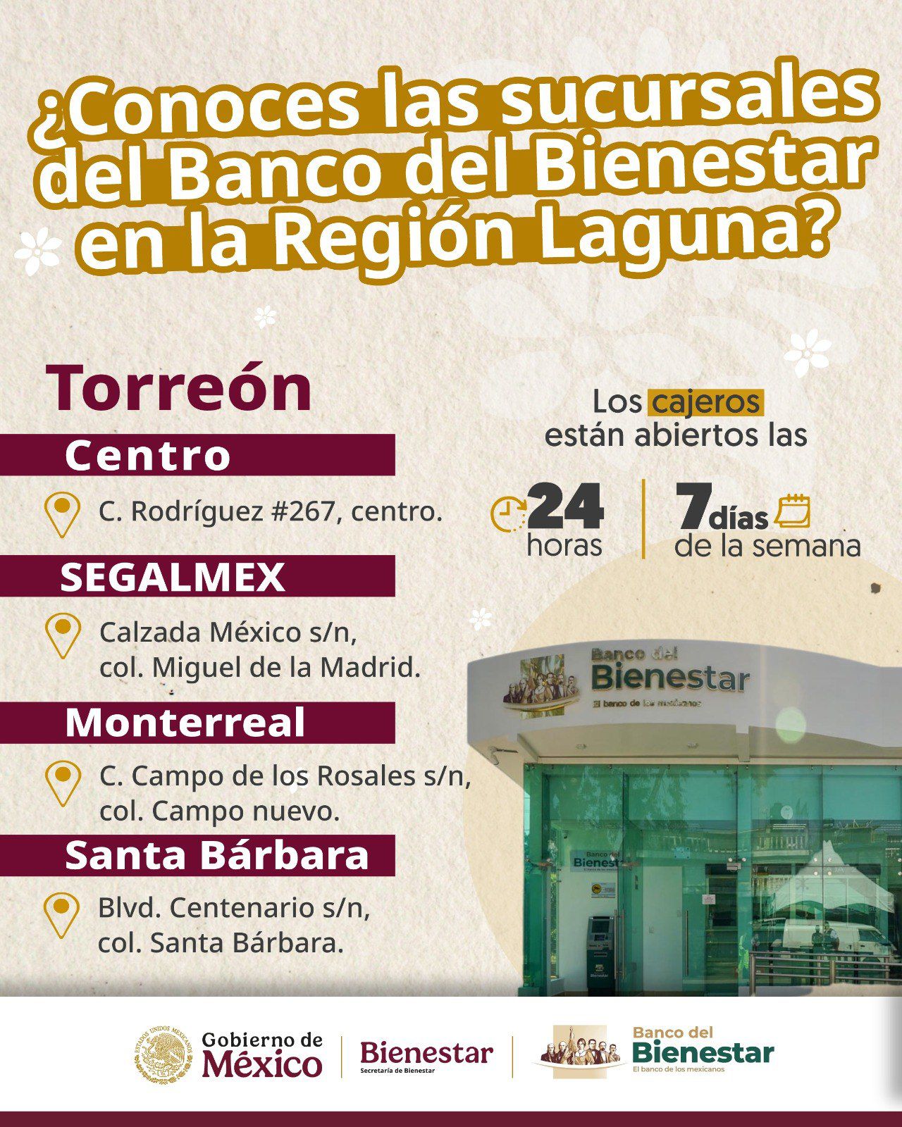Para mayor comodidad, se adjunta también una imagen con las sucursales del Banco del Bienestar ubicadas en Torreón, a fin de facilitar la localización del punto más cercano para el retiro de sus apoyos.