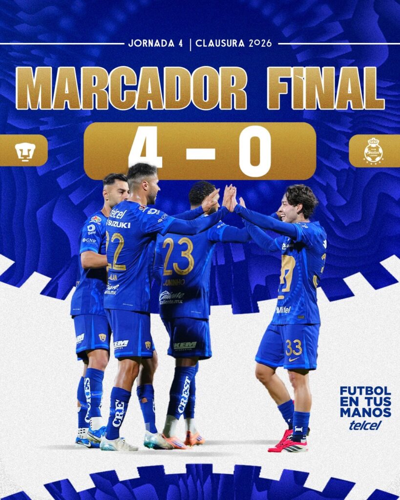 Santos Laguna vivió una noche complicada al caer 4 goles por 0 frente a los Pumas de la UNAM, en el duelo correspondiente a la Jornada 4 del Torneo Clausura 2026 de la Liga MX, disputado en el Estadio Olímpico Universitario.