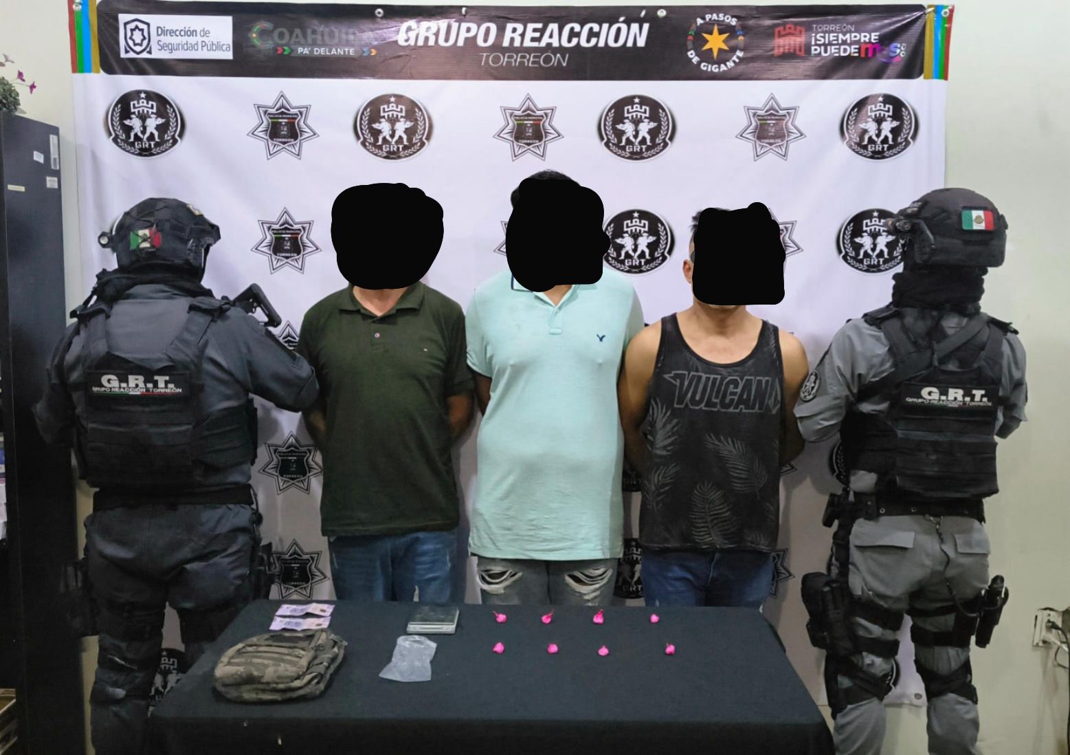 Torreón, Coahuila. – Elementos del Grupo Reacción Torreón detuvieron a tres hombres señalados por el presunto delito de posesión de narcóticos, luego de ser sorprendidos en actitud sospechosa en calles de la colonia Tierra y Libertad.