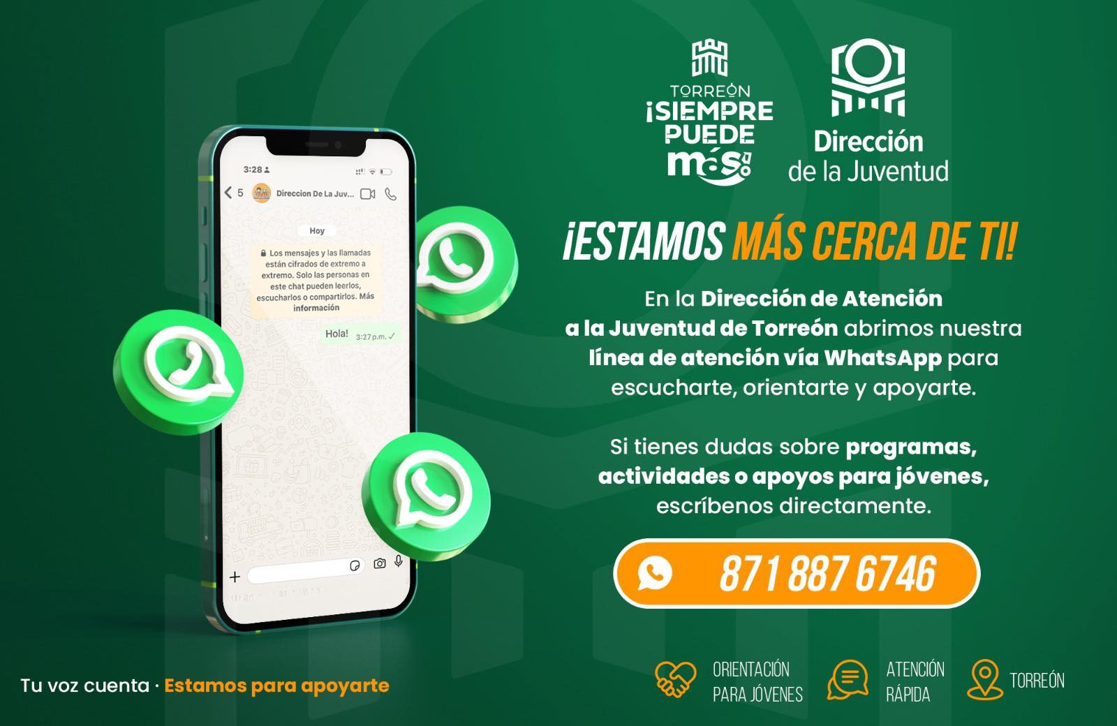 Torreón, Coahuila.– Con el objetivo de fortalecer la comunicación directa con la población joven, la Dirección de la Juventud de Torreón puso en marcha una nueva línea de atención a través de WhatsApp, mediante la cual se brindará información, orientación y acompañamiento a este sector.