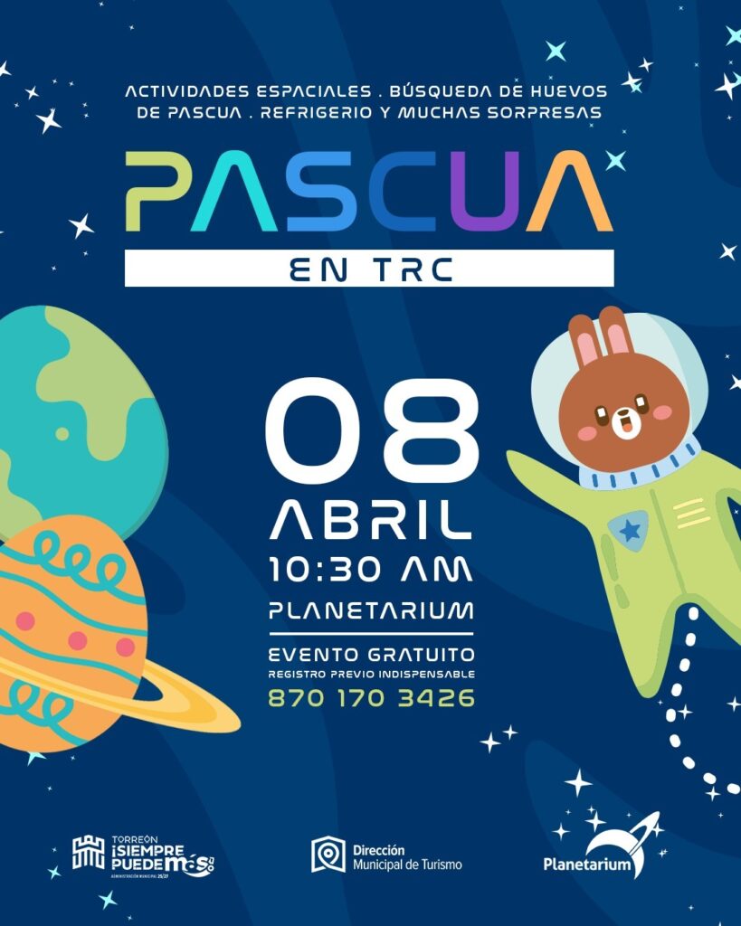 Durante el taller, los participantes podrán disfrutar de dinámicas como lotería turística, dibujo, juegos tradicionales, mapa del tesoro y búsqueda de huevos de Pascua, además de la compañía del personaje infantil “Choconejo” de Radio Torreón. El Planetarium también ofrecerá actividades para toda la familia, reforzando la convivencia y generando experiencias educativas y recreativas. El registro previo es obligatorio debido a cupo limitado, y los interesados pueden inscribir a sus hijos enviando un mensaje vía WhatsApp al 870 170 3426.