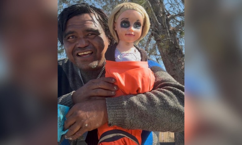Con una muñeca fea, de ojos verdes y mirada profunda, un hombre originario de Torreón, recorre las calles de Saltillo en busca de ayuda económica para sobrevivir.