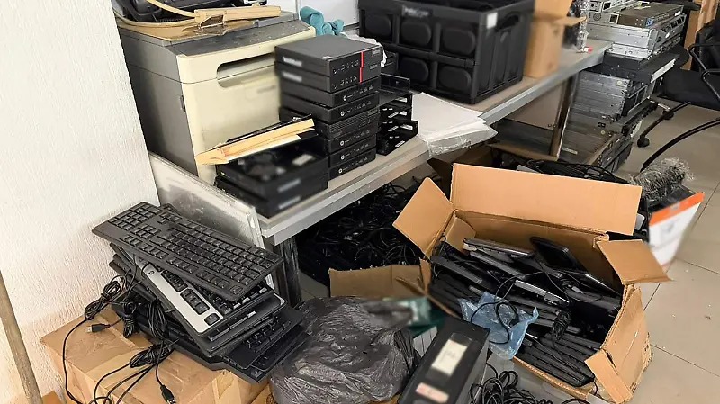 Se aseguraron 67 servidores informáticos, 2 mil 844 equipos de cómputo, 265 laptops, 353 discos duros, 277 CPUs, 404 teléfonos celulares, más de 3 mil chips de diversas compañías, 80 tokens de banca en línea, 11 terminales de cobro para tarjetas bancarias, 5 armas de fuego, dosis de narcóticos, básculas grameras y numerario.