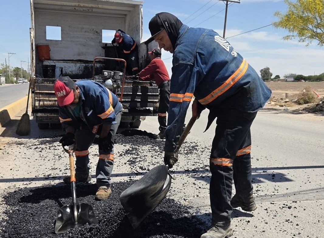 Entre las intervenciones recientes destacan trabajos en el Libramiento Norte–Matamoros, así como en los ejidos La Partida y La Paz, además de colonias como Lázaro Cárdenas y Compresora, donde se atendieron diversos puntos con deterioro en la carpeta asfáltica.