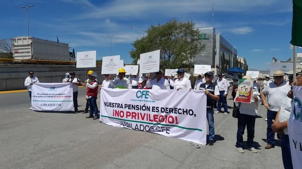 Gómez Palacio, Durango.– Un grupo de jubilados y pensionados y pensionadas de la Comisión Federal de Electricidad (CFE) se manifestó frente a las instalaciones de la paraestatal, ubicadas sobre el bulevar Miguel Alemán, en rechazo a los efectos del decreto de reforma al artículo 27 constitucional, el cual —aseguran— genera incertidumbre en torno a sus ingresos y derechos adquiridos.