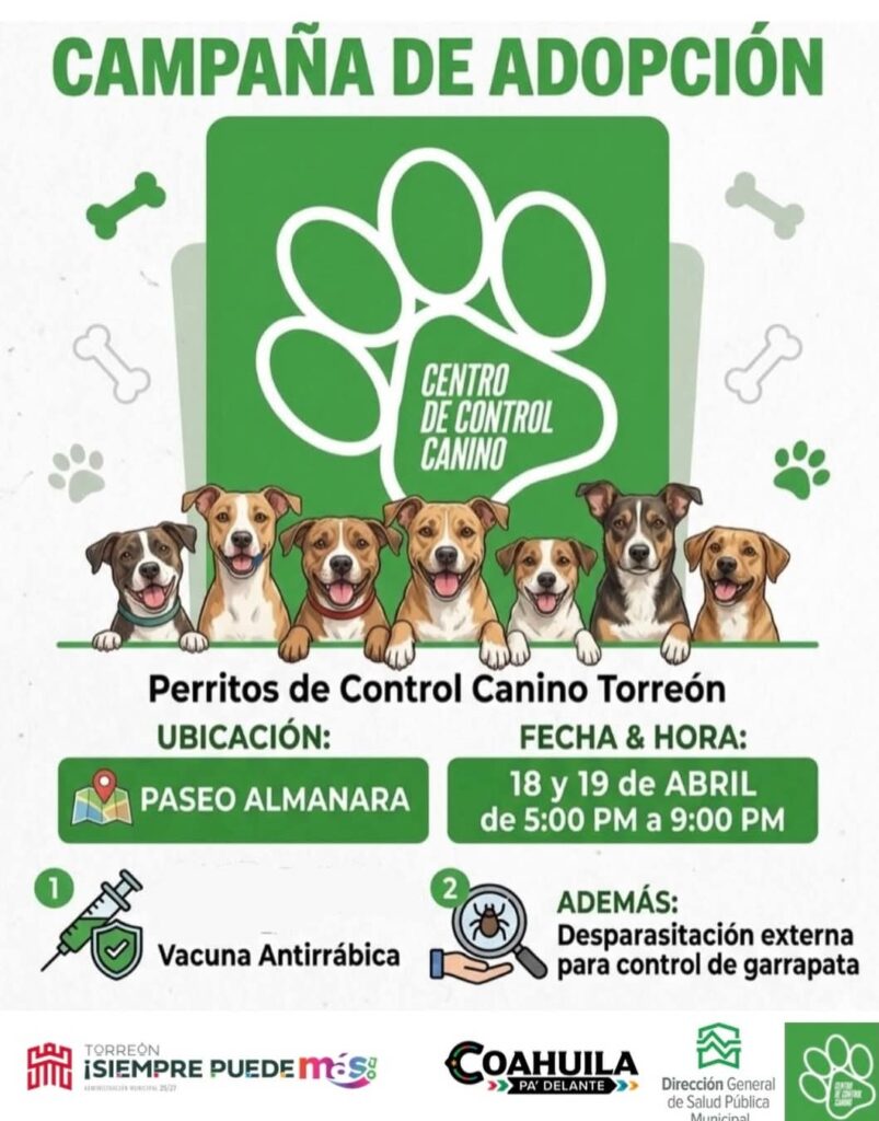 El Centro de Control Canino de Torreón invitó a la ciudadanía a participar en la próxima campaña de adopción de perritos, que se llevará a cabo los días 18 y 19 de abril en el Paseo Almanara, en un horario de 17:00 a 21:00 horas.