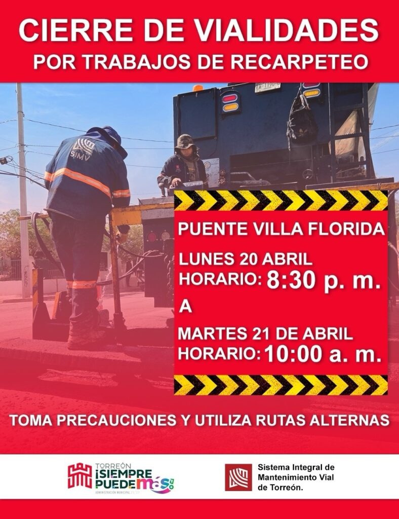 Con la finalidad de reforzar los últimos detalles de la obra del Sistema Vial Villa Florida, este lunes el personal del Sistema Integral de Mantenimiento Vial (SIMV), realizará trabajos de colocación de micro carpeta debajo del puente, motivo por el cual se implementará el cierre de esta vialidad en horario nocturno.