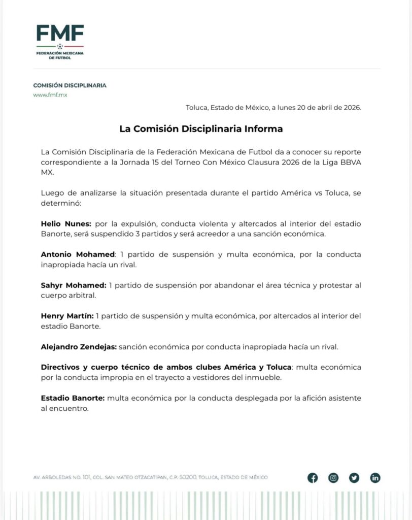 La Comisión Disciplinaria de la Federación Mexicana de Futbol (FMF) dio a conocer su reporte correspondiente a la Jornada 15 del torneo Clausura 2026 de la Liga BBVA MX, en el que se detallan diversas sanciones derivadas de los hechos ocurridos durante el encuentro entre Club América y Deportivo Toluca Fútbol Club.
