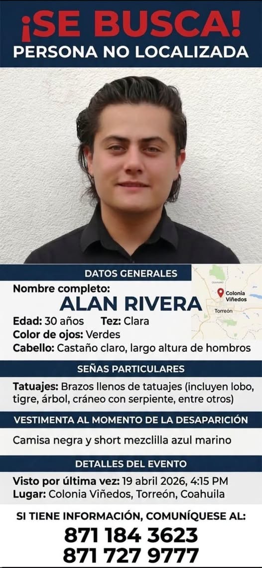 Familiares y personas cercanas solicitan el apoyo de la ciudadanía para dar con el paradero de Alan Rivera, de 30 años, quien fue visto por última vez el pasado 19 de abril de 2026 en la colonia Viñedos, en Torreón, Coahuila.
