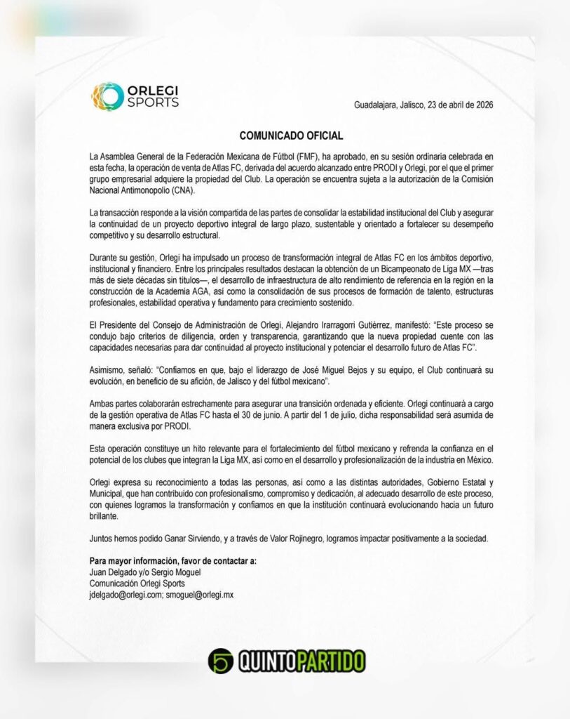 La Asamblea General de la Federación Mexicana de Futbol aprobó la operación de venta de Atlas FC, derivada de un acuerdo entre Grupo Orlegi y PRODI, por lo que este último adquirirá la propiedad del club, sujeto a la autorización de la Comisión Nacional Antimonopolio.
