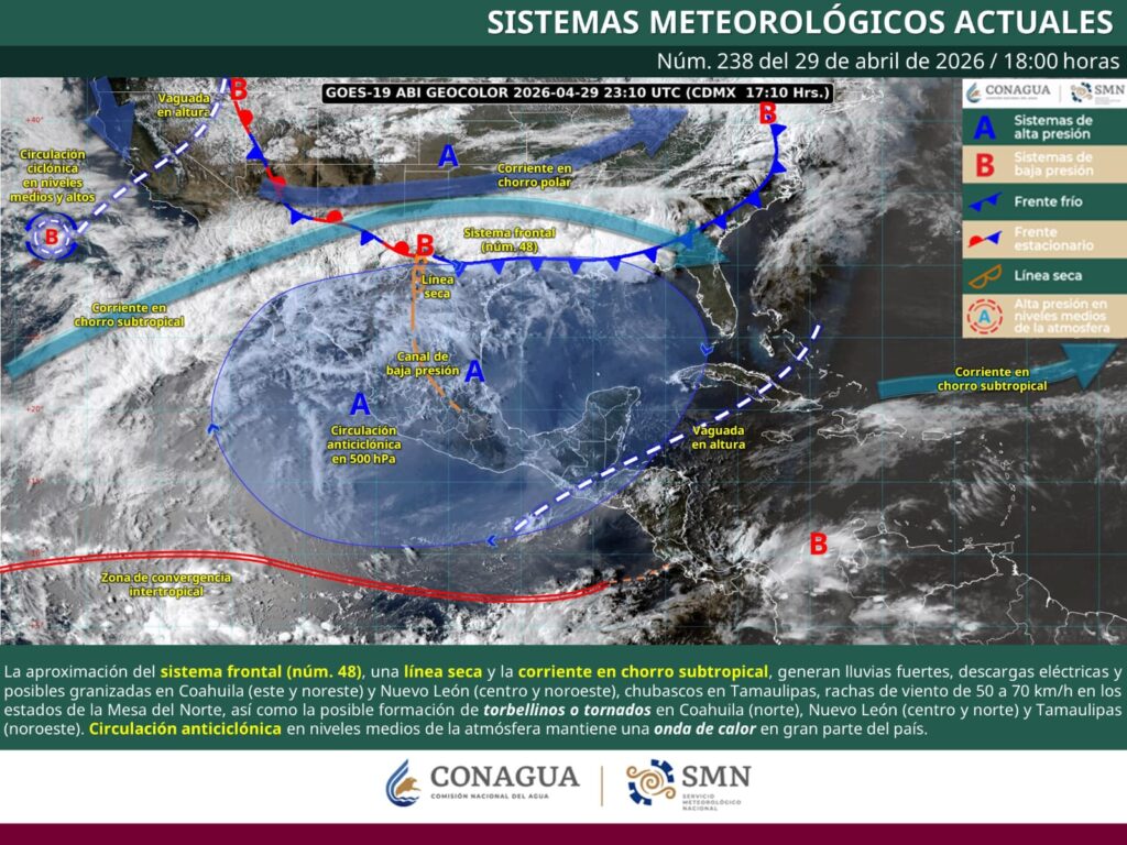 De acuerdo con el pronóstico del Servicio Meteorológico Nacional, estas condiciones se deben a la interacción de varios sistemas atmosféricos, entre ellos un canal de baja presión, inestabilidad atmosférica, una vaguada en altura, la corriente en chorro subtropical y el paso del frente frío número 48.